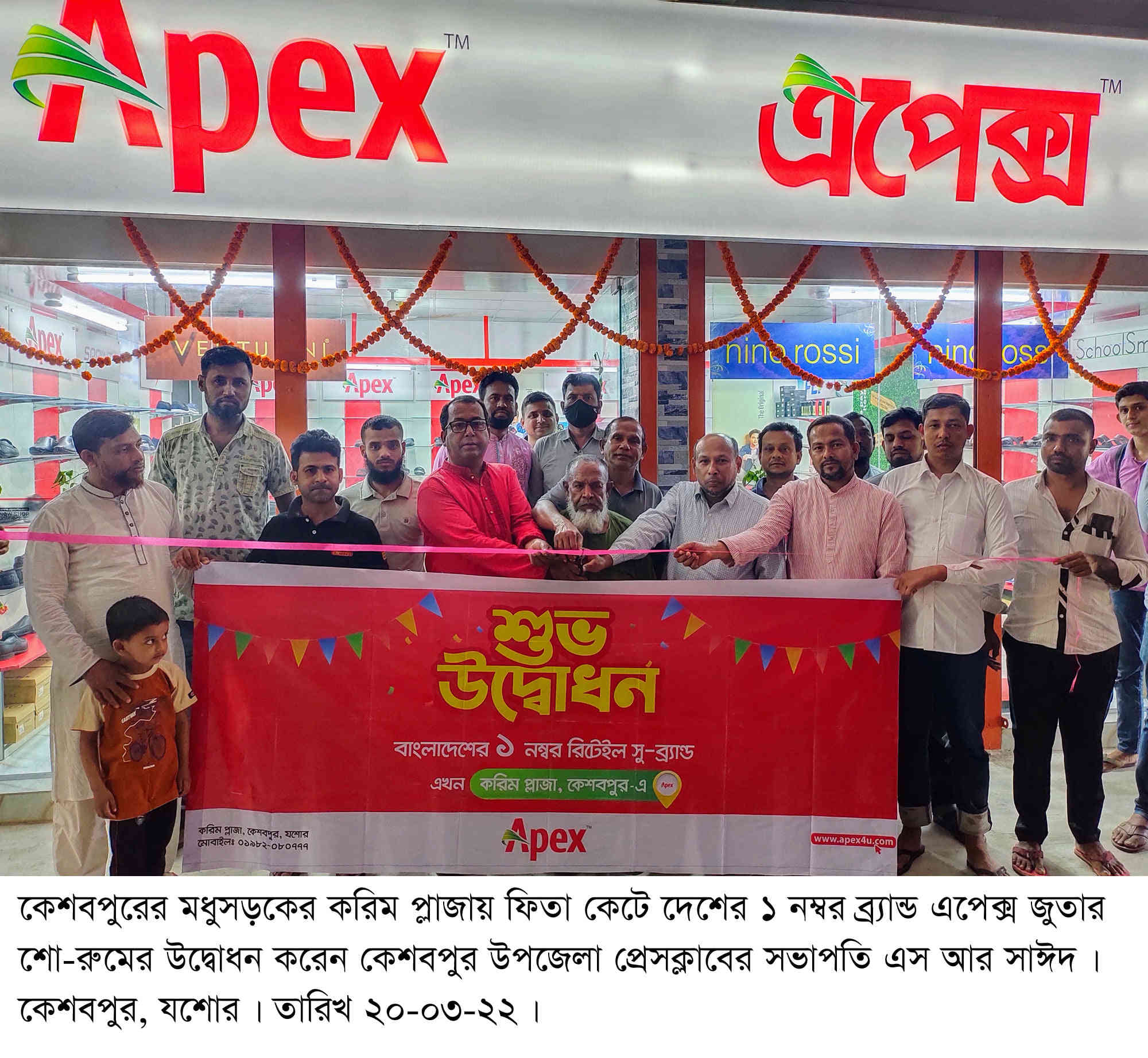 আর নয় যশোর আর নয় খুলনা,বাংলাদেশের ১ নম্বর সু-ব্র্যান্ড এপেক্স জুতা এখন কেশবপুরে। রবিবার বিকেলে মধুসড়কের করিম প্লাজায় দেশের ১ নম্বর সু-ব্র্যান্ড এপেক্স জুতার শো-রুমের উদ্বোধন করা হয়েছে।