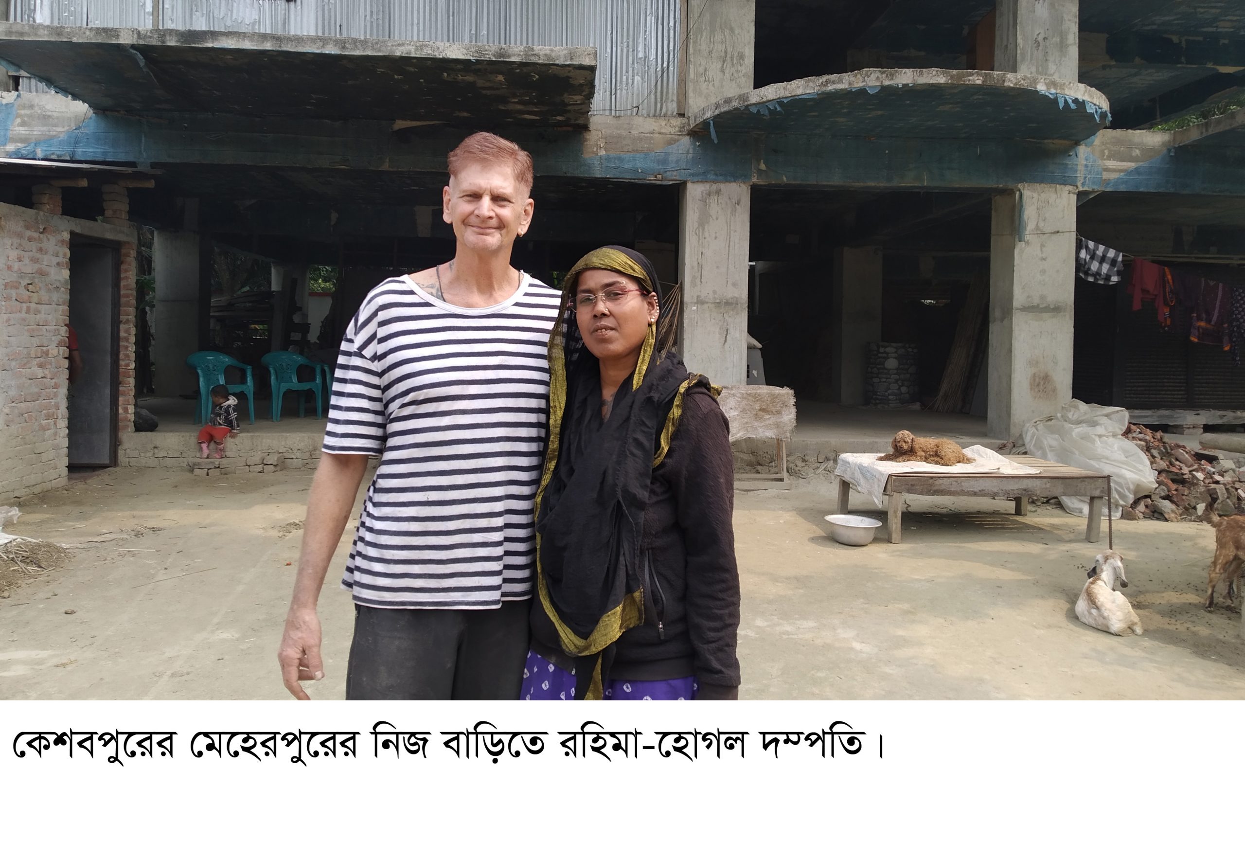 সরেজমিনে উপজেলার সাগরদাঁড়ি ইউনিয়নের মেহেরপুর গ্রামে ওই দম্পতির বাড়িতে গেলে দেখা যায়, দৃষ্টিনন্দন একটি বহুতল ভবনের কাজ চলছে। আমেরিকার প্রেট্রোলিয়াম ইঞ্জিনিয়ার ক্রিস্টফার মার্ক হোগল বাড়ির উঠানে বসে গরুর জন্য খাবার কাটছেন। রহিমা খাতুন উঠানের পাশেই গরু ও ছাগলকে খাওয়ানোর জন্য ঘাস পরিচর্যা করছেন। জানতে পারলাম, ক্রিস্টফার মার্ক হোগল কিছুটা বাংলা বলতে পারেন ও বোঝেন। ইংরেজিতে কথা হলে ক্রিস্টফার মার্ক হোগল জানায়, তার বাড়ি যুক্তরাষ্ট্রের মিশিগানে। পেশায় তিনি পেট্রোলিয়াম ইঞ্জিনিয়ার। রহিমা খাতুনের সঙ্গে ভারতের আসানসোলে তাঁদের প্রথম পরিচয় হয়। পরে তাঁরা একে-অপরকে ভালোবেসে ফেলেন। ভালোবাসার একপর্যায়ে ছয় মাস পর তারা ২০১০ সালের ১০ এপ্রিল বিবাহ বন্ধনে আবদ্ধ হন। তাঁর আমেরিকায় এক ছেলে ও এক মেয়ে রয়েছে। আমেরিকার স্ত্রীর সঙ্গে তাঁর অনেক আগেই বিবাহ বিচ্ছেদ হয়েছে। সেখানকার ছেলে-মেয়ের সঙ্গে যোগাযোগ রয়েছে।