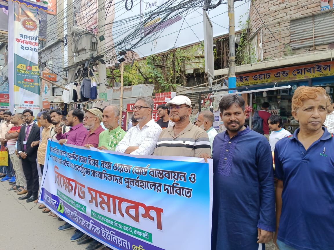 সাগর-রুনিসহ সকল সাংবাদিক হত্যার বিচার, নবম ওয়েজ বোর্ড বাস্তবায়ন ও দশম ওয়েজ বোর্ড গঠন এবং চাকরিচ্যুত সাংবাদিকদের পুনর্বহালসহ বিভিন্ন দাবিতে শনিবার (১ নভেম্বর) বেলা ১১টায় রাজশাহী নগরীর সাহেব বাজার জিরো পয়েন্টে অনুষ্ঠিত এ মানববন্ধন ও বিক্ষোভ সমাবেশে সাংবাদিক নেতারা এসব কথা বলেন।