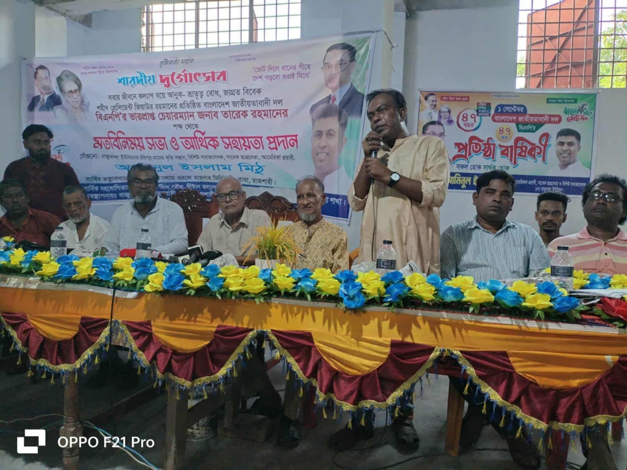 রাজশাহীর বাঘা উপজেলায় শারদীয় দুর্গোৎসব উপলক্ষে মতবিনিময় সভা ও আর্থিক সহায়তা প্রদান করা হয়েছে। শনিবার (২৭ সেপ্টেম্বর) বিকেল ৫ টায় চন্ডিপুর বাজার সংলগ্ন ১ নং বাজুবাঘা ইউনিয়ন বিএনপির আঞ্চলিক কার্যালয়ে এ অনুষ্ঠান অনুষ্ঠিত হয়।