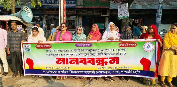 সরকারি প্রাথমিক বিদ্যালয়ের সহকারী শিক্ষকদের দশম গ্রেডে বেতন নির্ধারণের ন্যায্য দাবি আদায়ের আন্দোলনরত শিক্ষকদের উপর সম্প্রতি পুলিশ হামলার প্রতিবাদে উত্তপ্ত হয়ে উঠেছে লালমনিরহাট।