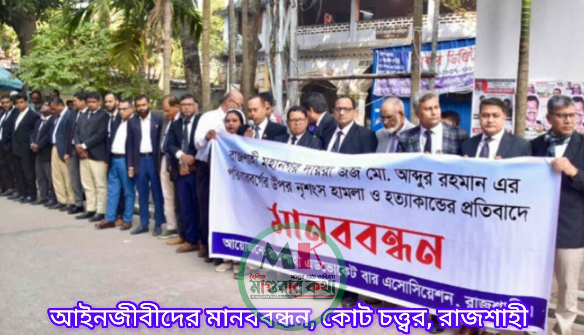 সোমবার (১৭ নভেম্বর) সকাল ১০ টায় রাজশাহী এডভোকেট বার এসোসিয়েশনের আয়োজনে আদালত চত্বরে এ মানববন্ধন অনুষ্ঠিত হয়। মানববন্ধনে সভাপতিত্ব করেন রাজশাহী এডভোকেট বার এসোসিয়েশনের সভাপতি আলহাজ্ব আবুল কাশেম। এতে রাজশাহী এডভোকেট বার এসোসিয়েশনের আইনজীবীরা অংশ নেন। তারা এই বর্বর হত্যাকাণ্ডের তীব্র নিন্দা জানিয়ে, অপরাধীর দ্রুত বিচার এবং দৃষ্টান্তমূলক শাস্তির দাবি করেন।