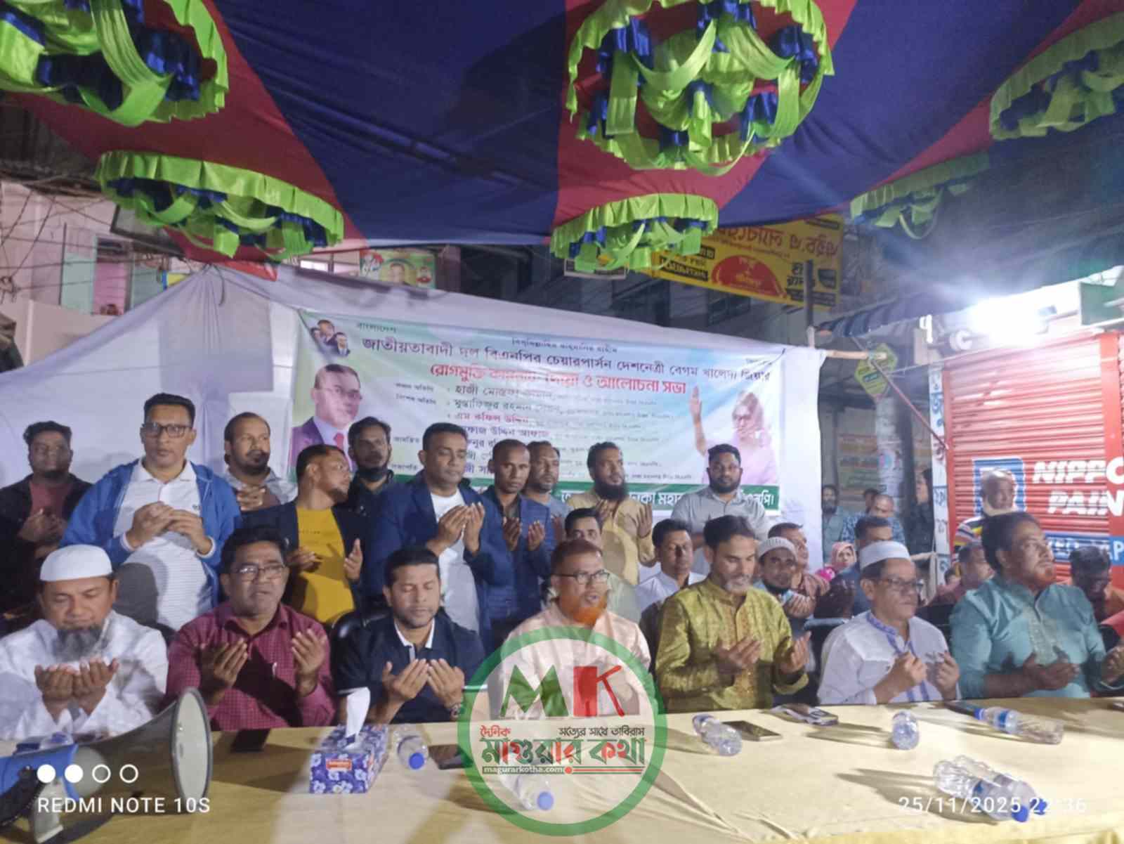 নার্গিস আক্তার স্মৃতিঃঢাকা মহানগর উত্তর ৫৪ নং ওয়ার্ড বিএনপি'র উদ্যোগে তুরাগের কামারপাড়া পুরান বাজার এলাকায় ৫৪ নং ওয়ার্ড বিএনপির সভাপতি হাজী শফিকুল ইসলামের সভাপতিত্বে ও তুরাগ থানা বিএনপি'র যুন্ম আহবায়ক মহিউদ্দিন সোহাগ রাজার এর সঞ্চালনায় কামারপাড়া পুরাতন বাজার এলাকায়, সাবেক প্রধানমন্ত্রী বেগম খালেদা জিয়ার সুস্থতা কামনায় জন্য দোয়া, আলোচনা সভা, তবারক বিতরণ অনুষ্ঠিত হয়েছে। প্রধান অতিথি হিসেবে উপস্থিত ছিলেন, ঢাকা মহানগর উত্তর বিএনপির সদস্য সচিব হাজী মোহাম্মদ মোস্তফা জামান, বিশেষ অতিথি হিসেবে উপস্থিত ছিলেন ঢাকা মহানগর উত্তর বিএনপির সিনিয়র যুন্ম আহবায়ক মোস্তাফিজুর রহমান সেগুন, যুন্ম আহবায়ক এম কফিল উদ্দিন আহমেদ, আমন্ত্রিত অতিথি হিসেবে উপস্থিত ছিলেন, তুরাগ থানা বিএনপির ভারপ্রাপ্ত আহবায়ক হারুনুর রশিদ খোকা, তুরাগ থানা বিএনপির সিনিয়র যুন্ম আহবায়ক ও ৫৪ নং ওয়ার্ড কাউন্সিলর পদপ্রার্থী হাজী মো: জহিরুল ইসলাম, উত্তরখান থানা বিএনপির আহবায়ক সুলতান মাহমুদ বকুল ,বিমানবন্দ থানা বিএনপির সিনিয়র যুন্ম আহবায়ক দেলোয়ার হোসেন দেলু, তুরাগ থানা বিএনপির যুগ্ম আহবায়ক রবিউল ইসলাম রুবু , যুন্ম আহবায়ক রিপন হাসান খন্দকার ,তুরাগ থানা বিএনপি'র যুন্ম আহবায়ক ও ৫৩ নং ওয়ার্ড কাউন্সিলর পদপ্রার্থী হাজী মোহাম্মদ চান মিয়া বেপারী ,যুন্ম আহবায়ক মোঃ মতি মিয়া ,যুগ্ম আহবায়ক হাজী মোহাম্মদ আতাউর রহমান ,যুন্ম আহবায়ক মোহাম্মদ বিপ্লব হোসেন ,তুরাগ থানা বিএনপি'র সাবেক যুন্ম সাধারণ সম্পাদক মোঃ মোস্তফা কামাল ,তুরাগ থানা বিএনপির আহবায়ক সদস্য মোঃ আব্দুল আলী ,৫৪ নং ওয়ার্ড বিএনপির সিনিয়র সহ-সভাপতি মোঃ সিদ্দিক সরকার সহ তুরাগ থানা ও ৫৪ নং ওয়ার্ড বিএনপি ও অঙ্গ সংগঠনের নেতৃবৃন্দ উপস্থিত ছিলেন, অনুষ্ঠান শেষে তবারক বিতরণ করা হয় ।