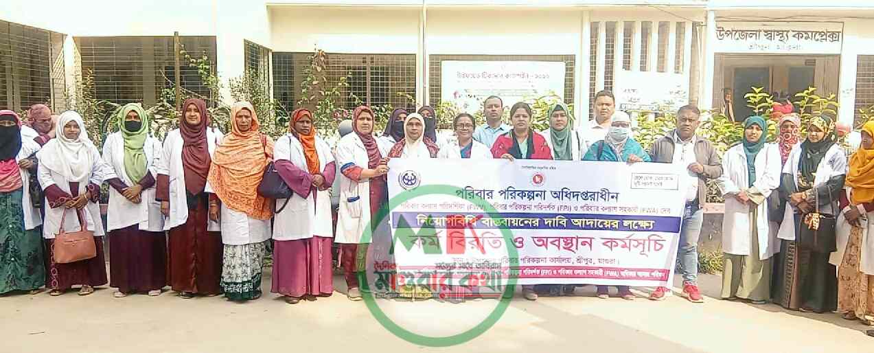 মাগুরার শ্রীপুরে পরিবার পরিকল্পনা অধিদপ্তরাধীন পরিবার কল্যাণ পরিদর্শিকা, পরিবার পরিকল্পনা পরিদর্শক ও পরিবার কল্যাণ সহকারীদের নিয়োগবিধি বাস্তবায়নের দাবি আদায়ের লক্ষে কর্ম বিরতি ও অবস্থান কর্মসূচি পালিত হয়েছে। মঙ্গলবার সকাল ১০ টায় উপজেলা পরিবার পরিকল্পনা কার্যালয়ের সামনে এ কর্ম বিরতি ও অবস্থান কর্মসূচি পালিত হয়।