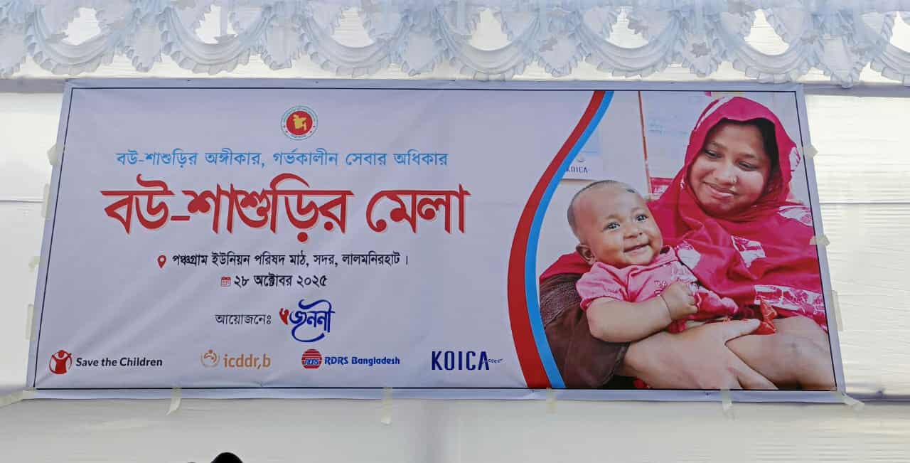 লালমনিরহাট সদর উপজেলার পঞ্চগ্রাম ইউনিয়ন পরিষদ মাঠে মঙ্গলবার(-২৮ অক্টোবর ২০২৫ ) কৈইকার অর্থায়নে সেভ দ্য চিল্ড্রেন বাংলাদেশ ও আরডিআরএস বাংলাদেশ বাস্তবায়িত জননী প্রকল্প এর উদ্যোগে এক বর্ণাঢ্য বউ-- শাশুড়ির মেলা অনুষ্ঠিত হয়েছে।