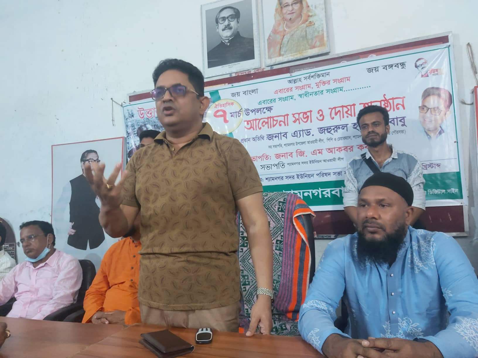 বিশেষ প্রতিনিধি : ঐতিহাসিক ৭ মার্চ উপলক্ষ্যে গতকাল রোববার বিকাল ৫ টায় আমরা শ্যামনগর বাসীর আয়োজনে শ্যামনগর সদর ইউনিয়ন পরিষদের সভাকক্ষে এক আলোচনা সভা ও দোয়া অনুষ্ঠান অনুষ্ঠিত হয়। শ্যামনগর সদর ইউনিয়ন আওয়ামী লীগের সভাপতি দৈনিক জাগরণের সাতক্ষীরা জেলা প্রতিনিধি আলহাজ্ব আকবর কবীরের সভাপতিত্বে উক্ত অনুষ্ঠানে প্রধান অতিথি ছিলেন উপজেলা আওয়ামীলীগের সিনিয়র সহ-সভাপতি, শ্যামনগর সদর ইউনিয়নের চেয়ারম্যান, নারী ও শিশু নির্যাতন দমন ট্রাইবুনালের পিপি এ্যাড. জহুরুল হায়দার বাবু।