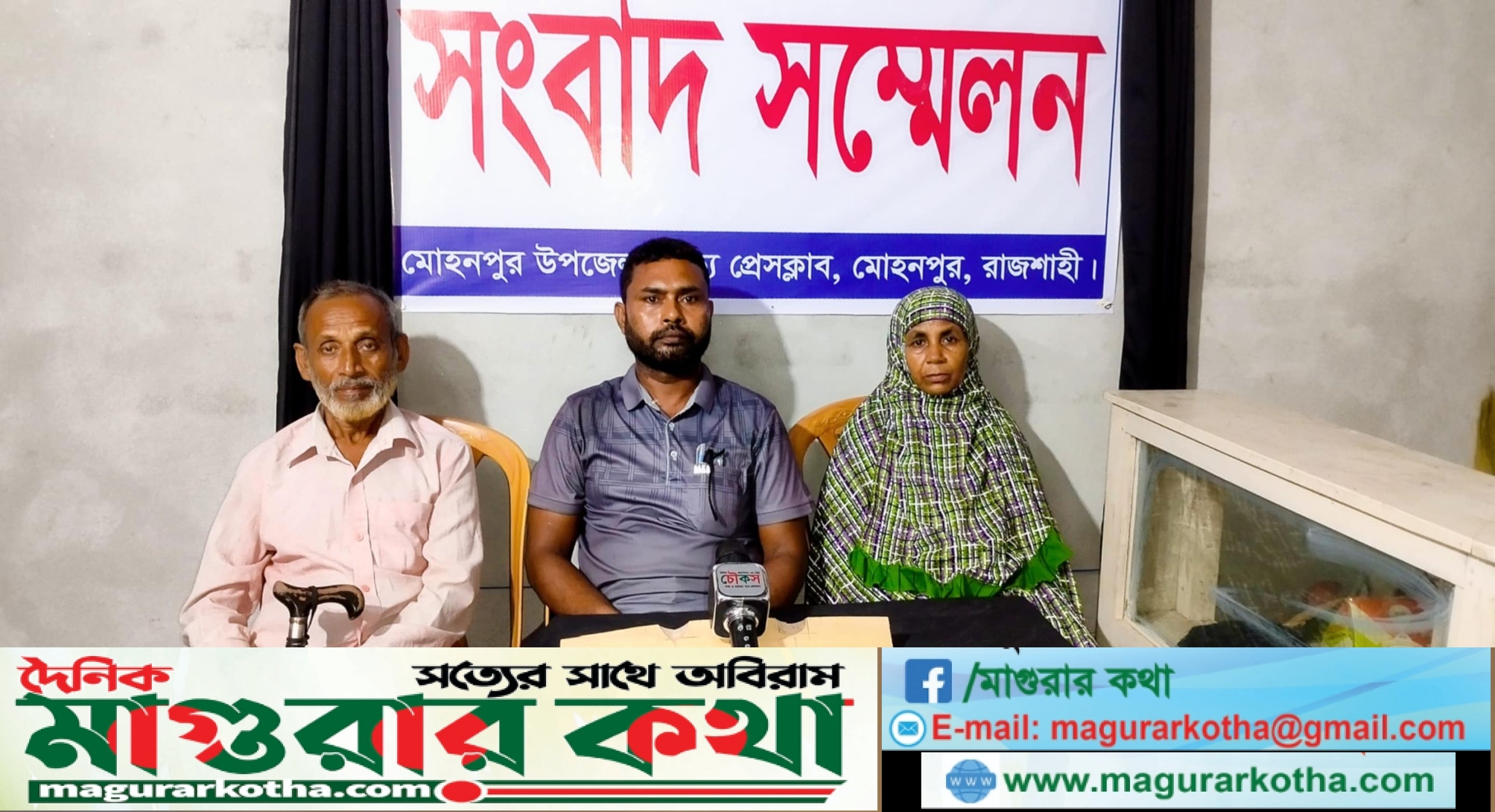 সংবাদ সম্মেলনে ভুক্তভুগী পরিবার জানান, রাজশাহীর দূর্গাপুর উপজেলার সূর্য্যভাগ গ্রামের আমজাদ আলীর মেয়ে আশুরা খাতুন (২৬) অর্থের লোভে একই গ্রামের ওমর আলীর ছেলে ফারুক হোসেনের বাড়িতে গত ১৬ আগস্ট বিয়ের দাবীতে অনশনের নাটক শুরু করে। এই মেয়ের মাধ্যমে অর্থের জন্য এলাকার কিছু দুষ্কৃতিকারীরা যোগ দিয়ে হুমকি প্রদান করছে ভুক্তভোগী পরিবারকে। পরে ছেলের মা বিমলা বিবি দূর্গাপুর থানায় গেলে নারী সিন্ডিকেটের লোকজনের বাঁধায় থানায় ঢুকতে না পেরে ফিরে আসেন। বর্তমানে আইনগত সেবা না পাওয়ায় ভুক্তভোগী পরিবারটি নিরাপত্তাহীনতায় ভুগছে। এঘটনার পর থেকে ভুক্তভোগী ফারুক হোসেনকে আর তার পরিবার খুজে পাচ্ছেনা। তাই নিরুপায় হয়ে জেলার মোহনপুর উপজেলায় গিয়ে সংবাদ সম্মেলন করেন ছেলের বাবা-মা ও ভগ্নিপতি।