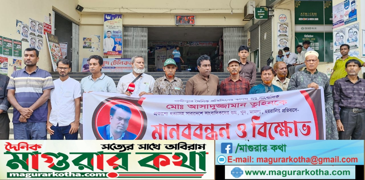 গাজীপুরের চান্দনা চৌরাস্তায় নির্মমভাবে নিহত সাংবাদিক আসাদুজ্জামান তুহিনের হত্যাকারীদের দ্রুত গ্রেপ্তার ও দৃষ্টান্তমূলক শাস্তির দাবিতে মানববন্ধন করেছেন রাজশাহীর বাগমারা প্রেসক্লাবের সাংবাদিকরা।