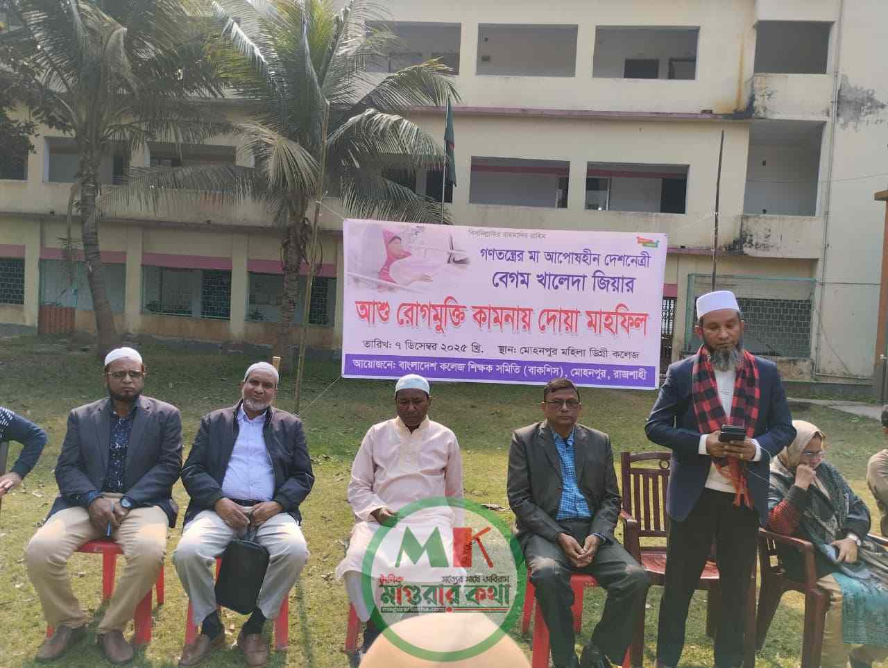 রাজশাহী মোহনপুরে বাংলাদেশ কলেজ শিক্ষক সমিতি (বাকশিস) মোহনপুর উপজেলা শাখার আয়োজনে গত ৭ ডিসেম্বর, রবিবার বেলা ১১.৩০ ঘটিকায় মোহনপুর মহিলা ডিগ্রি কলেজ প্রাঙ্গনে বিএনপি চেয়ারপার্সন,৩ বারের সাবেক প্রধানমন্ত্রী,গনতন্ত্রের মানস কণ্যা,বর্তমানে রাষ্ট্রের সর্বোচ্চ সম্মানিত ও গুরুত্বপূর্ণ ব্যক্তি,মানবতার মা, বেগম খালেদা জিয়ার আশু রোগ মুক্তি কামনায় আলোচনা সভা ও দোয়া মাহফিল অনুষ্ঠিত হয়েছে। মোহনপর উপজেলা বাকশিসের সভাপতি সহকারী অধ্যাপক মো: শাহ আলমের সভাপতিত্বে ও বাকশিসের যুগ্ম সাধারণ সম্পাদক,সহকারী অধ্যাপক মো: মফিজ উদ্দীন সরকার এর সঞ্চালনায় প্রধান অতিথি উপস্থিত হিসেবে ছিলেন মোহনপুর উপজেলা বিএনপি’র সাধারণ সম্পাদক, সাবেক চেয়ারম্যান,জননেতা মোঃ মাহবুব আর রশিদ,বিশেষ অতিথি হিসেবে উপস্থিত ছিলেন মোহনপুর উপজেলা বিএনপি’র সিনিয়র যুগ্ম সাধারণ সম্পাদক ও সাবেক চেয়ারম্যান মো: কাজিম উদ্দীন সরকার, মোহনপুর মহিলা ডিগ্রি কলেজের ভারপ্রাপ্ত অধ্যক্ষ মিসেস নাজনীন আরা, বাকশিসের সিনিয়র সহ সভাপতি ও সহকারী অধ্যাপক ইমরান পারভেজ, সহ সভাপতি ও সহকারী অধ্যাপক বাবুল আক্তার, সাধারণ সম্পাদক ও সহকারী অধ্যাপক রবিউল হোসেন, সিনিয়র যুগ্ম সাধারণ সম্পাদক ও সহকারী অধ্যাপক খুশবর আলী,সাংগঠনিক সম্পাদক ও সহকারী অধ্যাপক জাহাঙ্গীর আলম,ছাত্রনেতা শাহরিয়ার ইমন সহ মোহনপুর উপজেলার বিভিন্ন কলেজ থেকে আগত শিক্ষক কর্মচারী এবং বাকশিসের নেতৃবৃন্দ উপস্থিত ছিলেন।