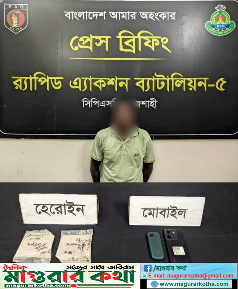 রাজশাহীতে জুতার ভিতরে হেরোইন পাচারকালে ১ জনকে গ্রেফতার করেছে র‍্যাব-৫