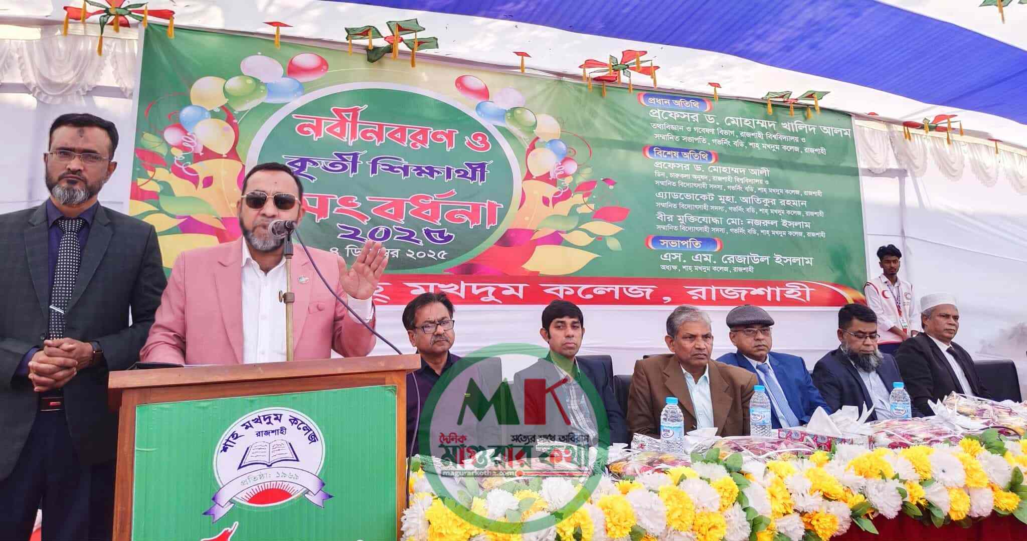 রাজশাহীতে শাহ্ মখদুম কলেজে উৎসবমুখর পরিবেশে নবীনবরণ অনুষ্ঠান অনুষ্ঠিত হয়েছে। বৃহস্পতিবার (৪ ডিসেম্বর) সকাল থেকে কলেজ প্রাঙ্গণে আয়োজিত এ অনুষ্ঠানে নতুন শিক্ষার্থীদের বরণ করে নেওয়া হয় ফুল দিয়ে। এর আগে বিএনপির চেয়ারপারসন ও সাবেক প্রধানমন্ত্রী বেগম খালেদা জিয়ার রোগমুক্তি কামনায় দোয়া মাহফিল অনুষ্ঠিত হয়। সকাল ১০টায় অনুষ্ঠিত নবীনবরণে প্রধান অতিথি হিসেবে উপস্থিত ছিলেন কলেজের গভর্নিং বডির সভাপতি ও রাজশাহী বিশ্ববিদ্যালয়ের প্রফেসর ড. মোহাম্মদ খালিদ আলম। নবাগত শিক্ষার্থীদের উদ্দেশে তিনি বলেন, “শিক্ষাজীবনের এই নতুন যাত্রা হবে দায়িত্ব, শৃঙ্খলা এবং মানবিক মূল্যবোধে পরিপূর্ণ। সুনাগরিক হিসেবে গড়ে ওঠার জন্য এখন থেকেই আত্মনিয়োগ করতে হবে। নিয়মিত ক্লাস, অধ্যবসায় ও সময়কে যথাযথ কাজে লাগানোই সফলতার মূল চাবিকাঠি।”