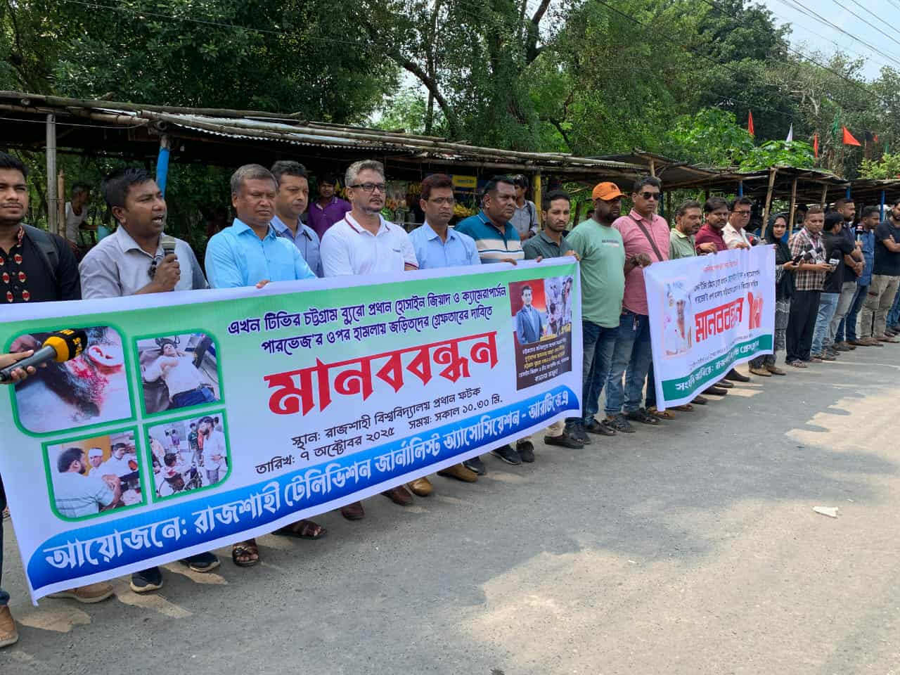 চট্টগ্রামের সীতাকুণ্ডের সলিমপুরে সংবাদ সংগ্রহ করতে গিয়ে এখন টেলিভিশনের চট্টগ্রাম ব্যুরো প্রধান হোসাইন জিয়াদ ও চিত্র সাংবাদিক পারভেজসহ তিন সাংবাদিকের ওপর হামলার ঘটনায় জড়িতদের দ্রুত গ্রেপ্তারের দাবিতে রাজশাহীতে মানববন্ধন অনুষ্ঠিত হয়েছে।